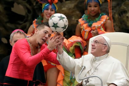 La pelota de fútbol siempre fue una pasión del papa Francisco: aquí, en 2019, un miembro del Circo de Cuba le muestra cómo girar el balón en su mano, en una audiencia general en el VaticanoAndrew Medichini – AP